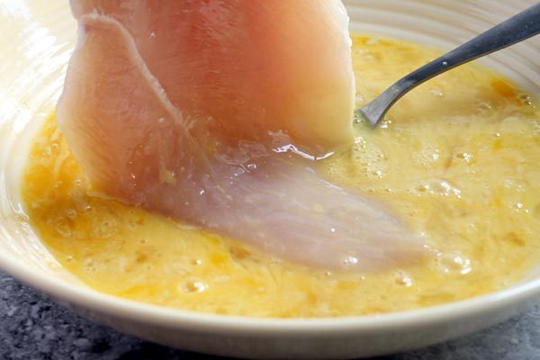 - Dip each chicken piece in the egg mixture and then the breadcrumbs.
