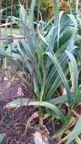 Scapes grow in the middle of the garlic plant, and about 3-4 weeks before the garlic is ready to be dug, the scape will shoot up, curl around once or twice, and keep growing upward. As soon as they curl around, they need to be cut, so the plant can focus on putting its energy into growing the bulb.