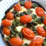 - Place oiled caps on lined baking sheet and evenly divide the mozzarella cheese between them. Top each cap with sliced grape tomatoes and drizzle with pesto. Sprinkle with salt and pepper, according to taste.