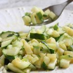 How to Dice Fresh Zucchini – Cut the zucchini into round thin slices. Stack about 3-4 slices on top of each other and cut into strips. Cut the strips into small pieces.