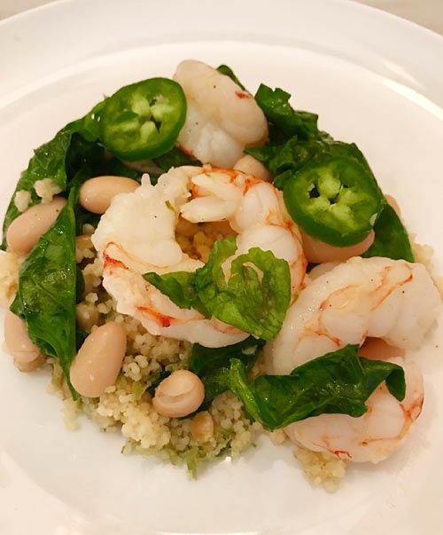 - When shrimp is almost cooked though, add the cannellini beans and fresh baby spinach.